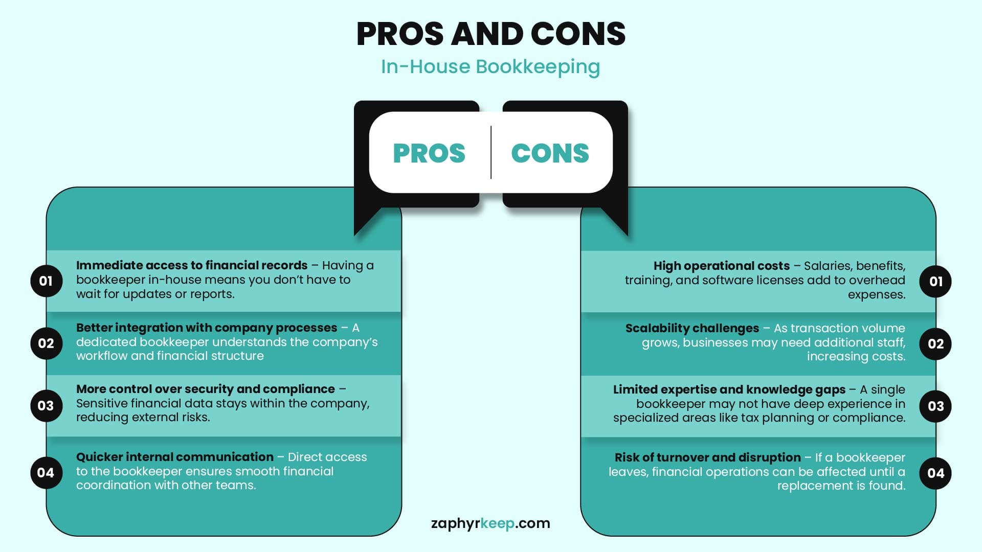 The infographic below highlights the key pros and cons of in-house bookkeeping for quick comparison.