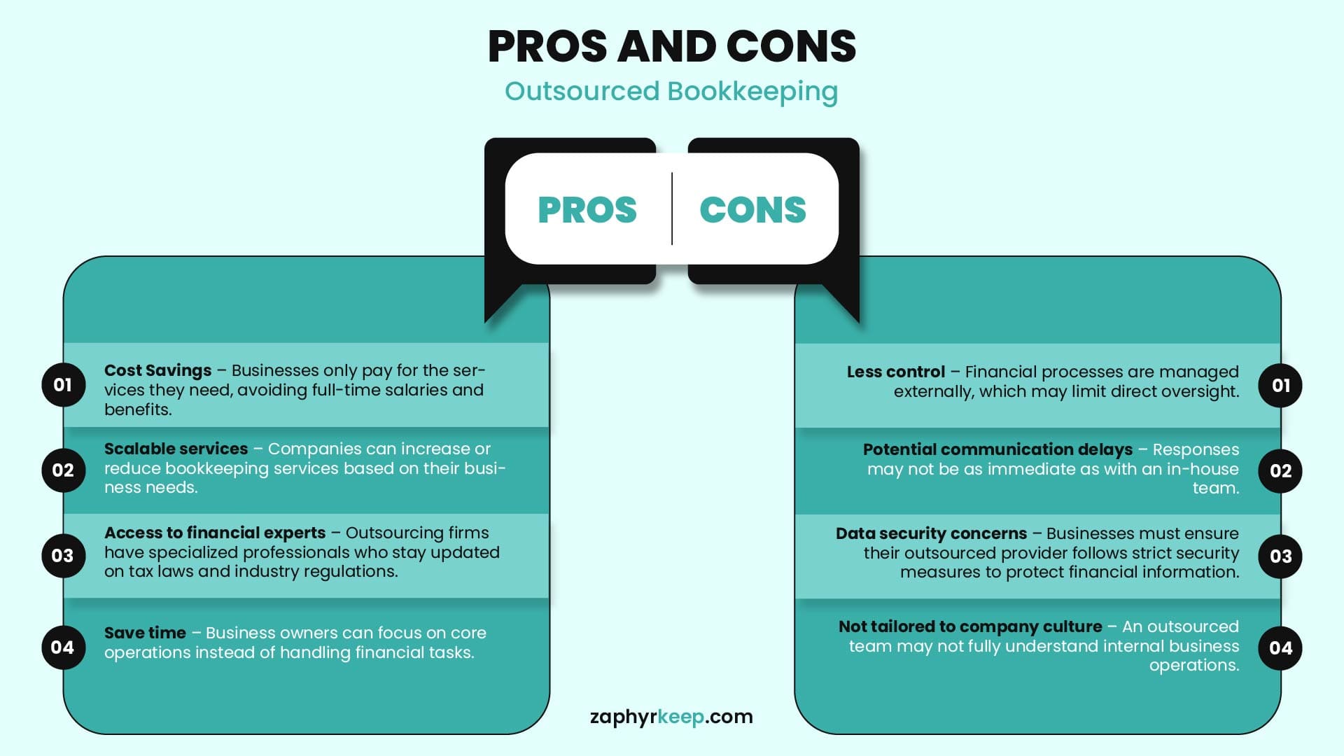 The following visual highlights the key pros and cons of outsourcing bookkeeping.